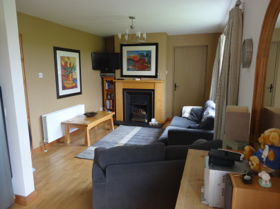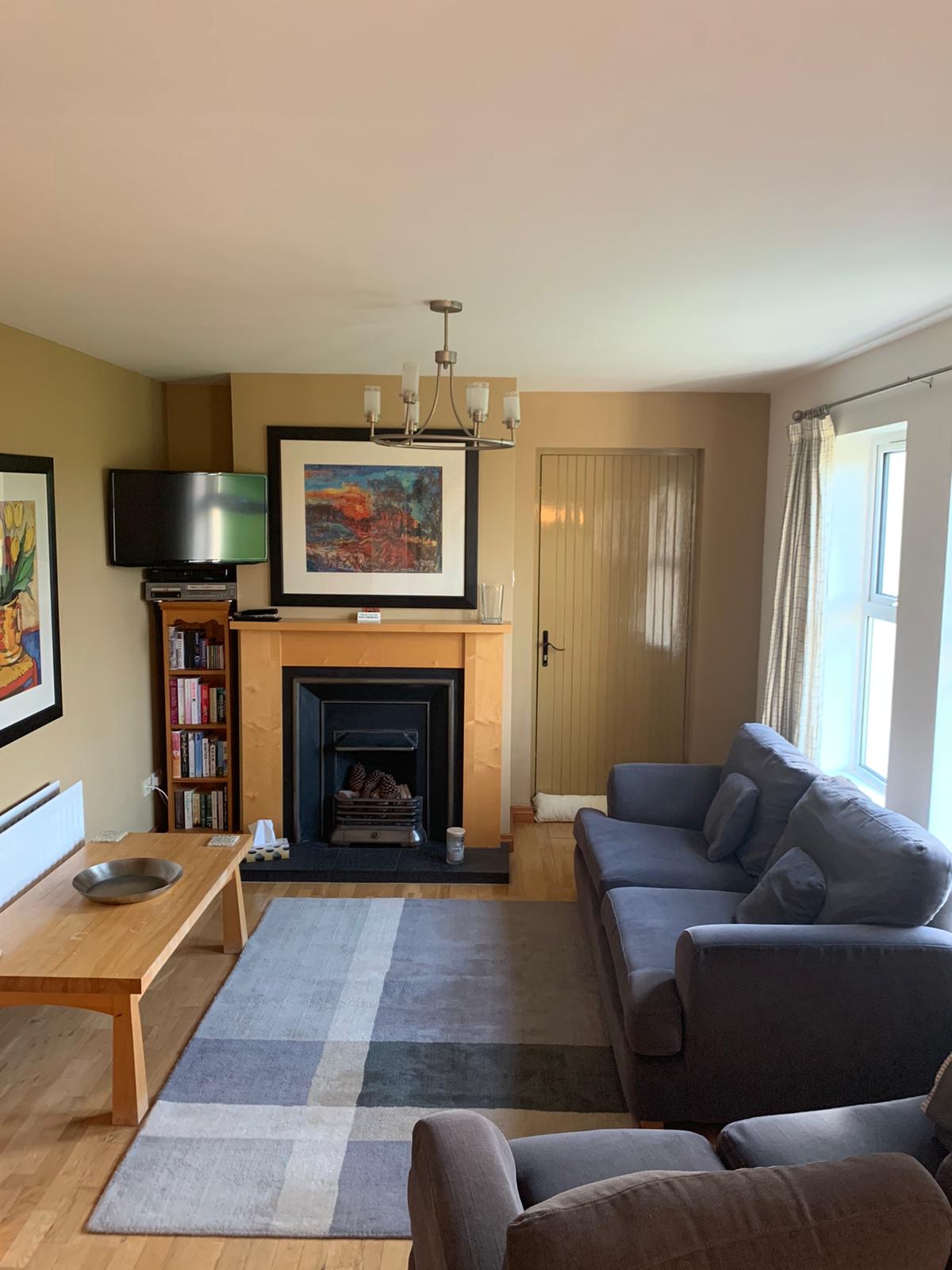 The living room has 2 comfortable sofas for you to lounge in, while you take in the view across the fields to the Causeway coast. There’s also a TV with Freeview to allow you watch your favourite programmes. A door here leads to the outside patio area. You can listen to you favourite tunes on the hifi. The dining area has a table that can seat up to 6 people, equipped with Denby tableware. The kitchen is fully equipped to make your stay as comfortable as possible with an oven, hob, kettle, toaster, dishwasher, fridge freezer and washing machine. There’s even a bread maker should you wish to bake your own bread!