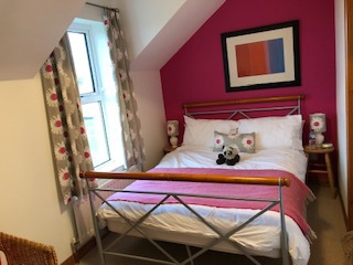 Upstairs the master bedroom overlooks the fields with views to the sea at Portballintrae – on a clear day you can see as far as Donegal! This bedroom has a double bed with ensuite shower room, along with a colour TV