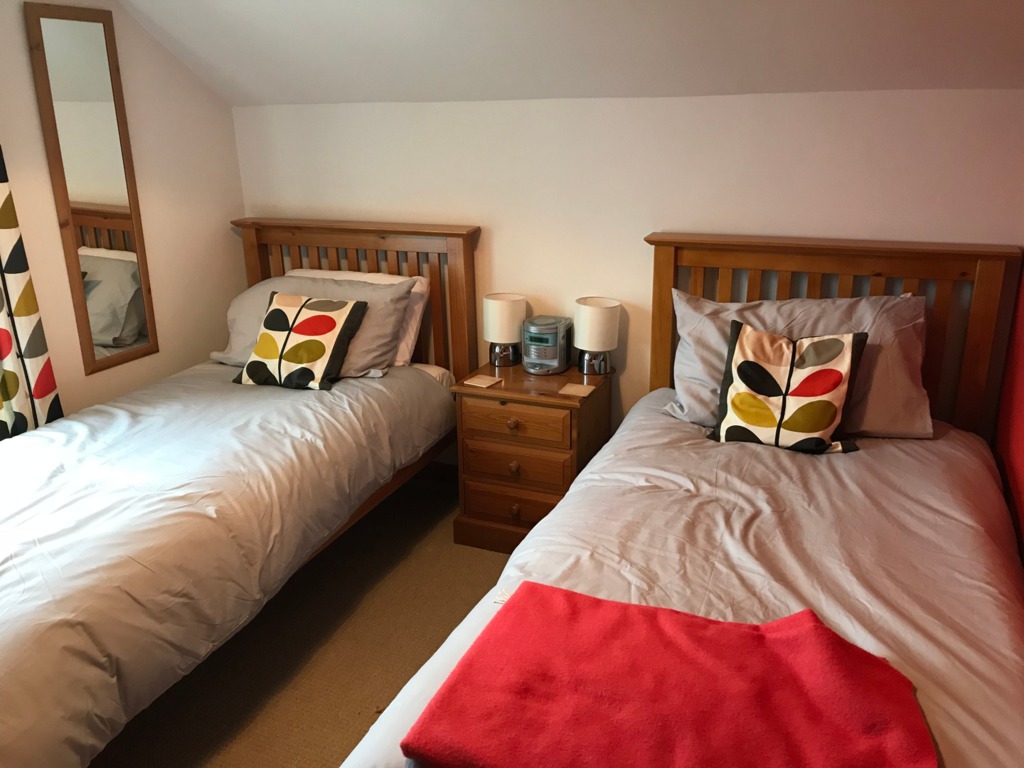 The second bedroom has twin beds and enjoys views of the local countryside.